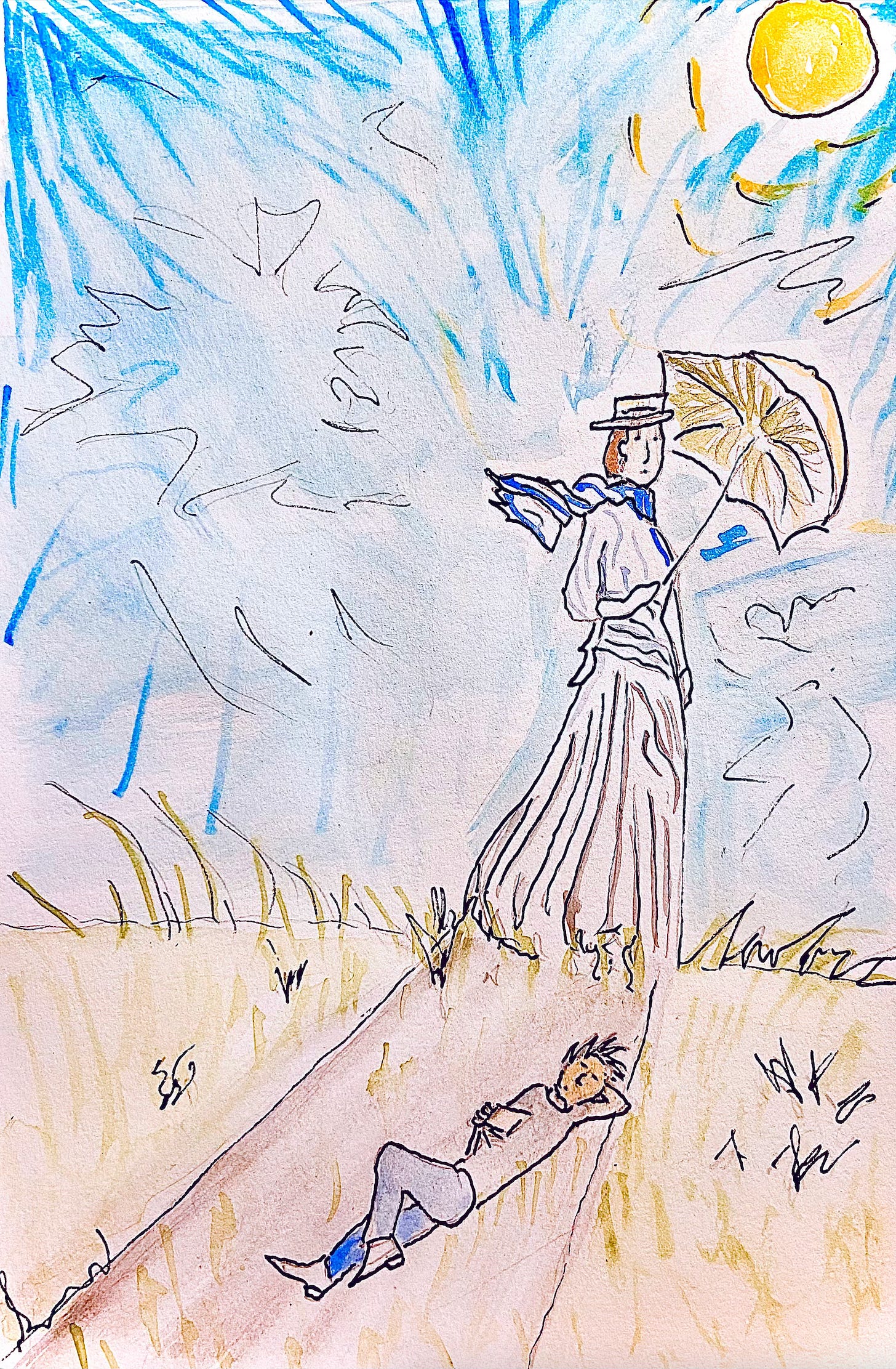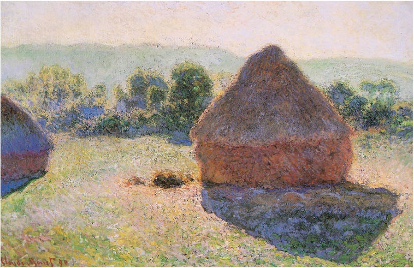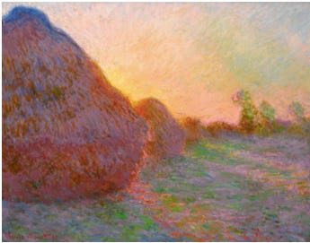 WHEN A BIG CLAUDE MONET came to the Denver Art Museum, I went twice. Once to the member preview, and again when my son Jake and his wife Lisa flew out from Brooklyn. For me, the exhibit changed from one visit to the next, just like the haystacks near Giverny did for Monet, from the summer 1890 to springtime 1891. That’s when he painted perhaps the most famous series of paintings ever done. Of humble haystacks!