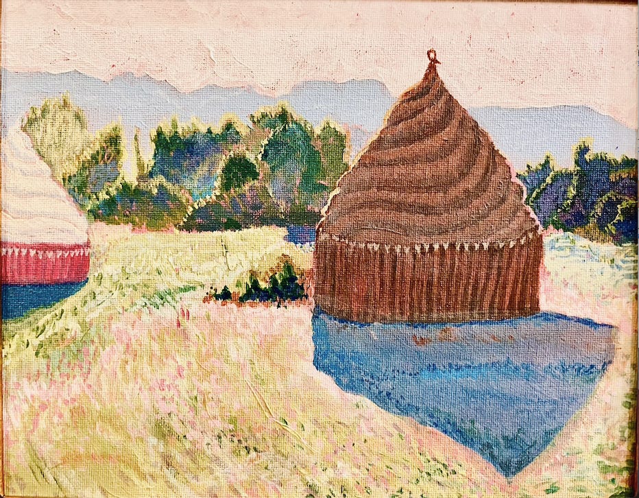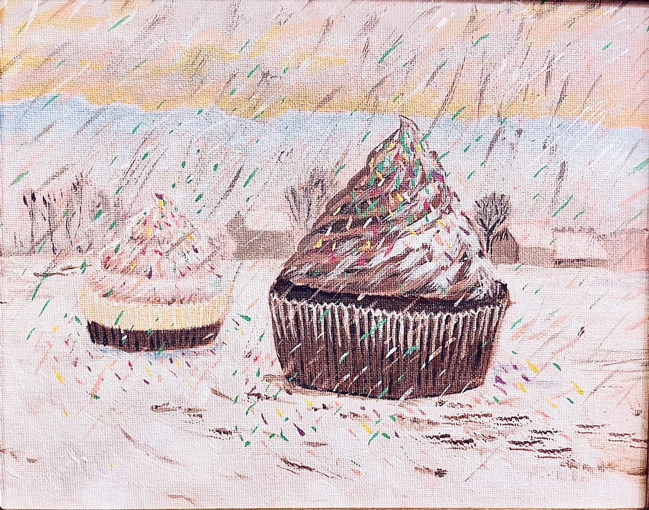 my mind started making connections. Or maybe I was just yearning for a snack. Why, I thought, Monet’s haystacks look just like cupcakes! Soon I was ready for a new project in my acrylic-painting class, and this hit the canvas.